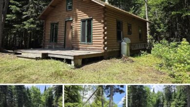 Inside, the cabin includes a loft-style bedroom and an additional sleeping area on the main floor. A basic kitchen setup covers essential needs, and a wood stove provides heat. While the cabin does not include a bathroom, it’s designed for off-grid use, making it ideal for weekend stays or a remote getaway.
